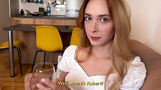 Gorgeous blonde with a brilliant assets lets her roommate fuck her jaws and pussy for paying a rent