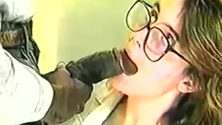 Nerdy cutie in black stockings gives BJ and gets screwed from behind