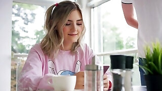 Gorgeous blonde with a brilliant assets lets her roommate fuck her jaws and pussy for paying a rent